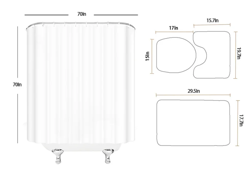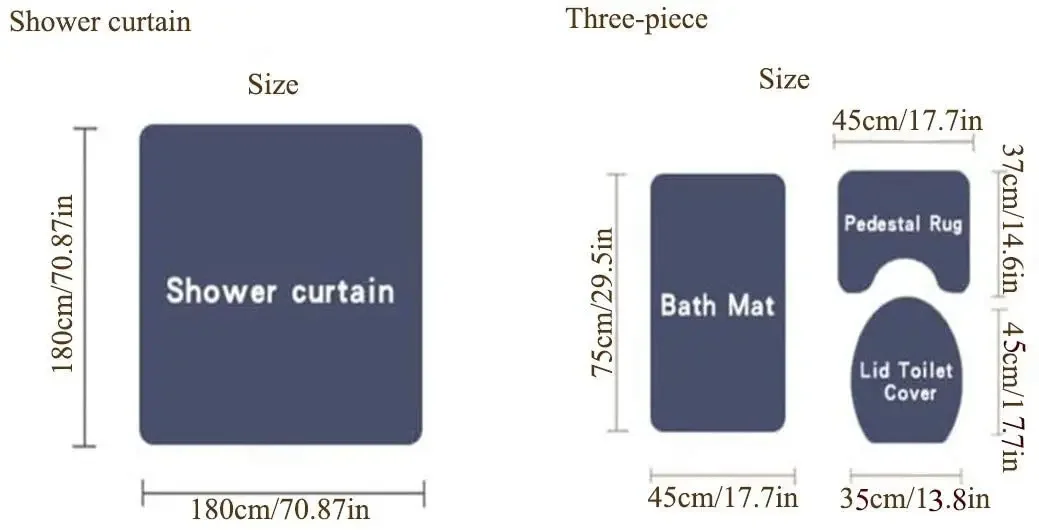 Features: 1. Flannel fabric, very soft feeling and comfortable, PVC mesh bottom, non-toxic, odorless, not moldy. 2. Easy absorb water and dust good slip resistance; 3. Easy to clean, can be directly washed by washing machine or hands, not shed and fade, the back avoid to direct sunlight. 4. High density super soft fabrics, comfortable, environmental protection, good ventilation. Specifications: Shower Curtain Material: Waterproof Polyester Fabric Bath Mat Material: Flannel And Plastic Bottom Blanket Surface Color: As picture shown Shower curtain size: 180x180cm - 70x70in Square size: 75x45cm - 29.5x17.7in Toilet cover size: 43x38cm -17x15in U shape size: 40x50cm -15.7x19.7in Note: 1.Manual measuring, please allow 1 ~ 3 cm error,thank you. 2.Try to use the shower curtain leveled ventilation to keep the surface dry. 3.Due to the different display and different light, the picture may not reflect the actual color of the item,Thanks for your understanding. 4pcs set ● 1 x Shower curtains (With 12 hooks) ● 1 x Pedestal Rug ● 1 x Lid Toilet Cover ● 1 x Bath Mat