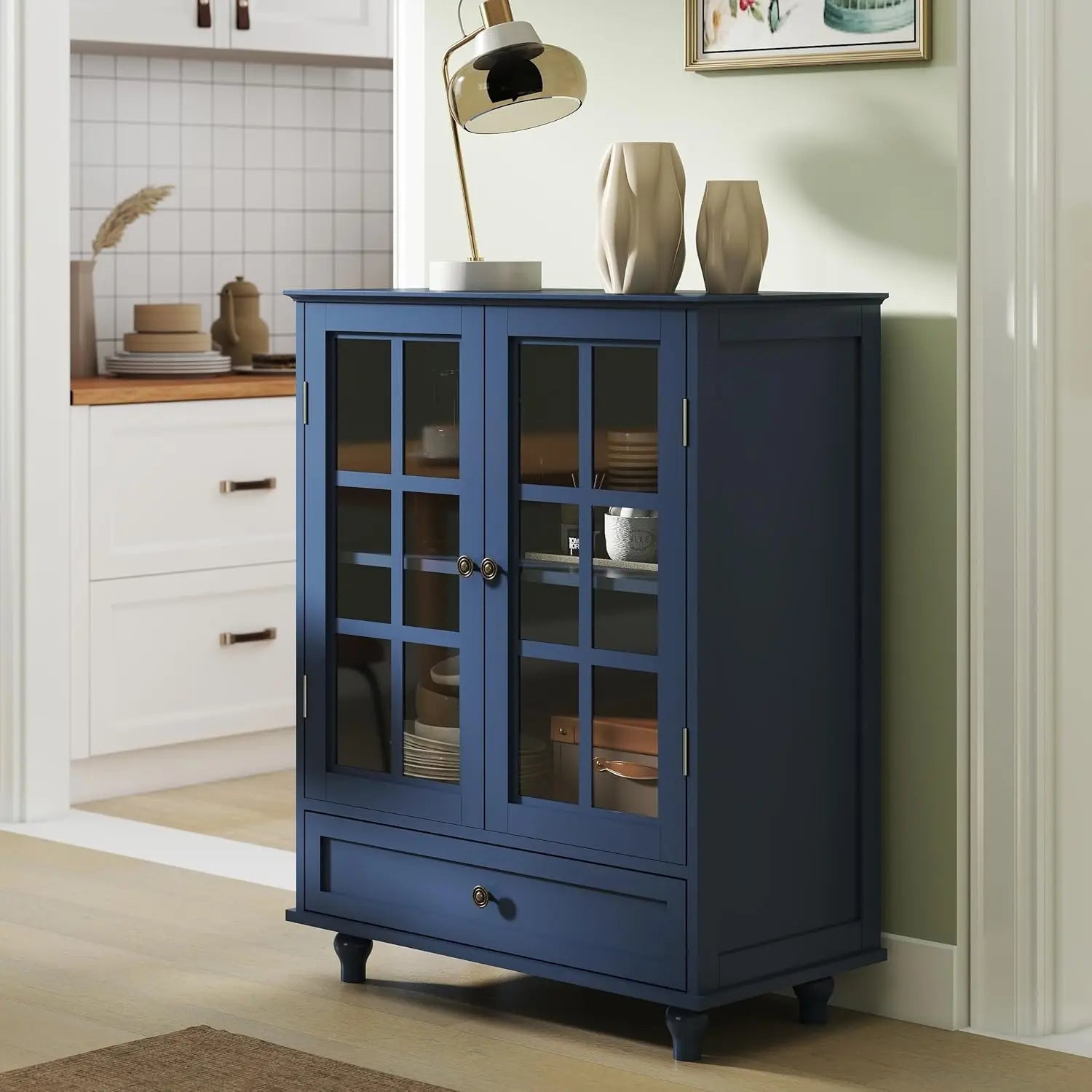 Buffet Cabinet with Glass Doors and Drawer, Modern Wood Storage Sideboard for Dining Room & Living Room, 28 Inch Accent Cabinet