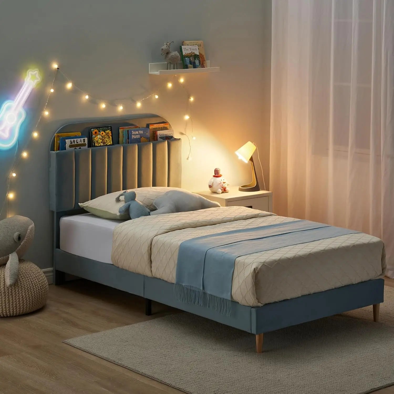 Twin Size Bed Frame, Velvet Upholstered Platform Bed Frame with Storage Headboard.
